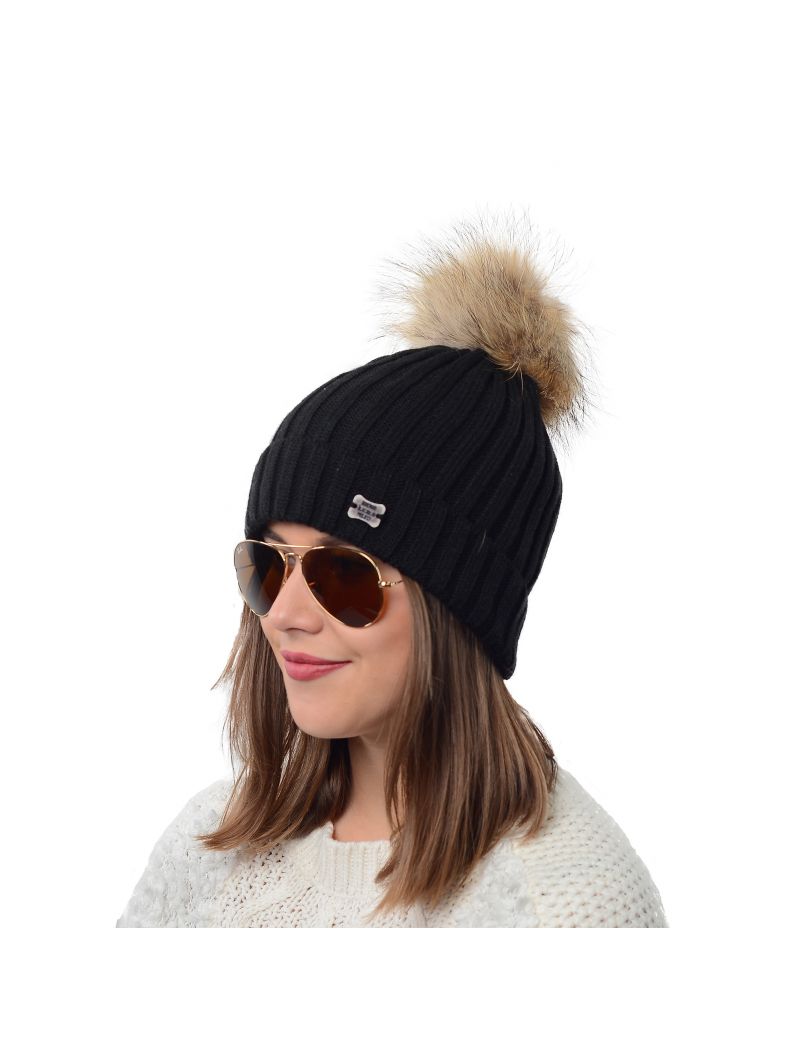 Dámská čepice, 100% akryl, barva černá, bambule přírodní hnědá, pravá kožešina